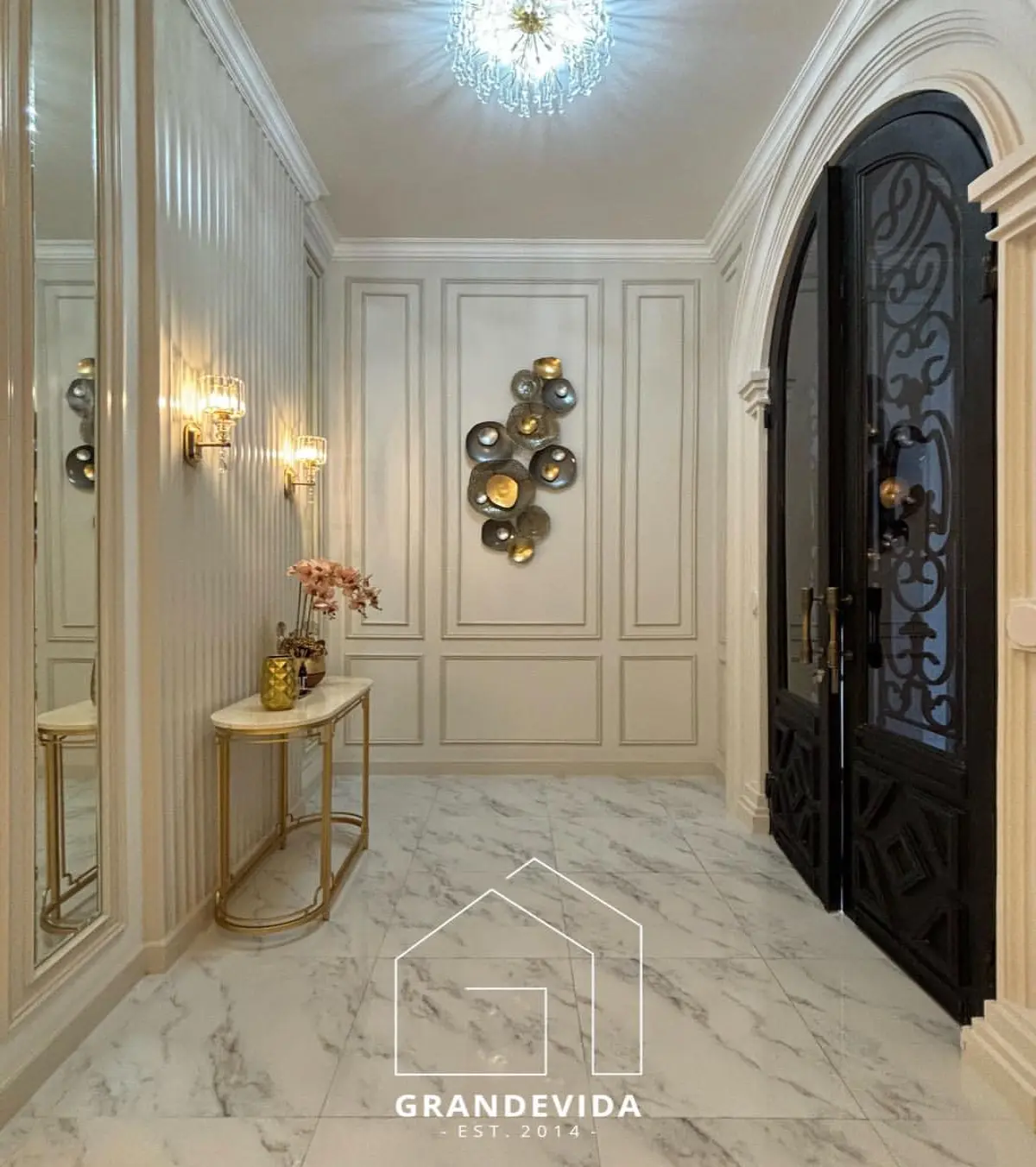 Material mewah: Lantai Marmer Ujung Pandang (Lt. 1 & 2) dan Pintu Utama Kayu Jati.